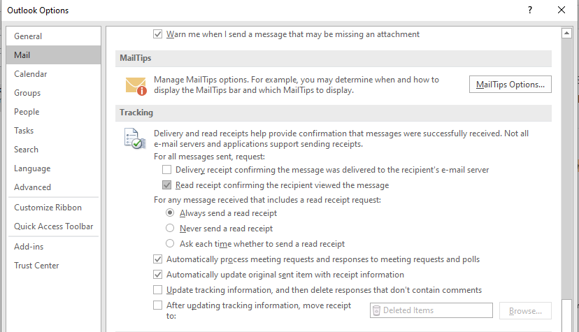 To configure a Read Receipt for all emails, in the top left hand corner of Outlook, click File->Options->Mail. Scroll down to the Tracking section.