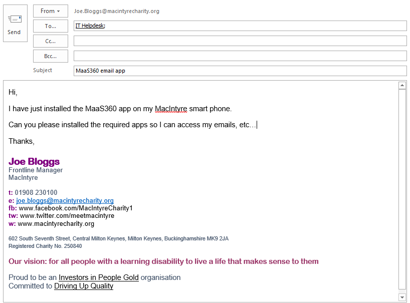 Now MaaS360 has been set-up, us the link below 'How to use Email in MaaS360' and follow Step 4 to edit your email signature.
