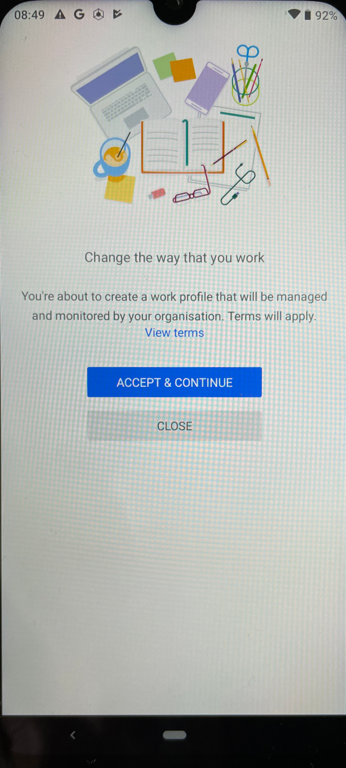 The phone will go through a number of screens whilst it installs a Work Profile onto it.