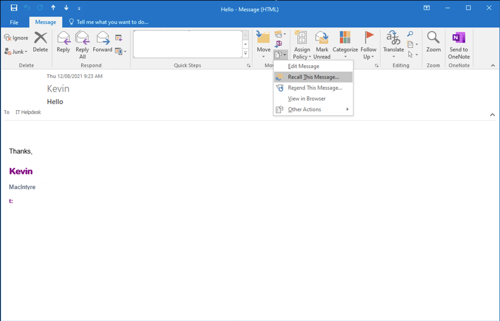 In the Move section of the Home Ribbon, click ‘Actions’ then ‘Recall This Message’.