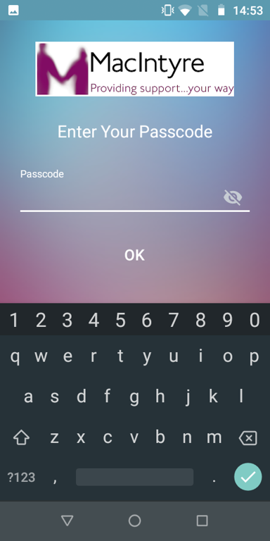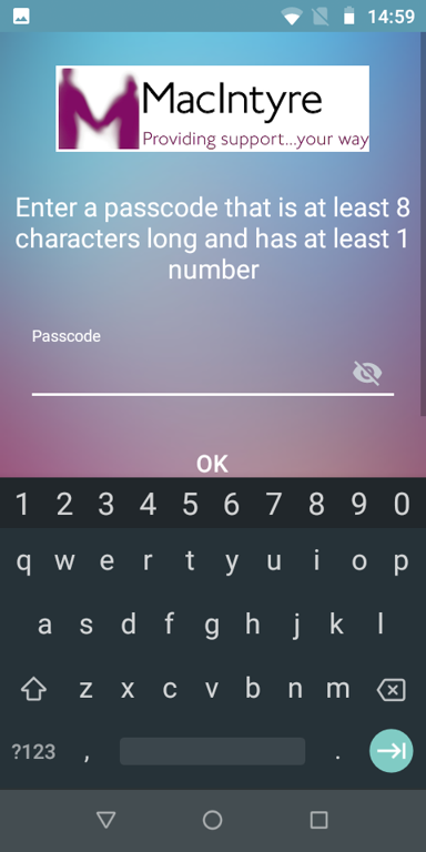 If the email password was successful, enter a new Passcode; noting the passcode requirements of minimum 8 characters with at least one letter and/or number, then tap 'OK'