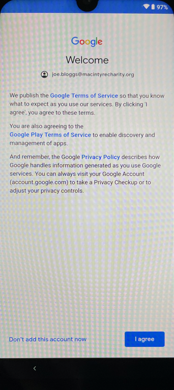 Even if you already have a personal Google account, on the MacIntyre supplied device, you must create one using your MacIntyre email address.The Google account is used for the Play Store, which is how you download apps; including the required apps for email access.