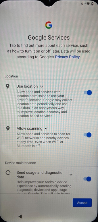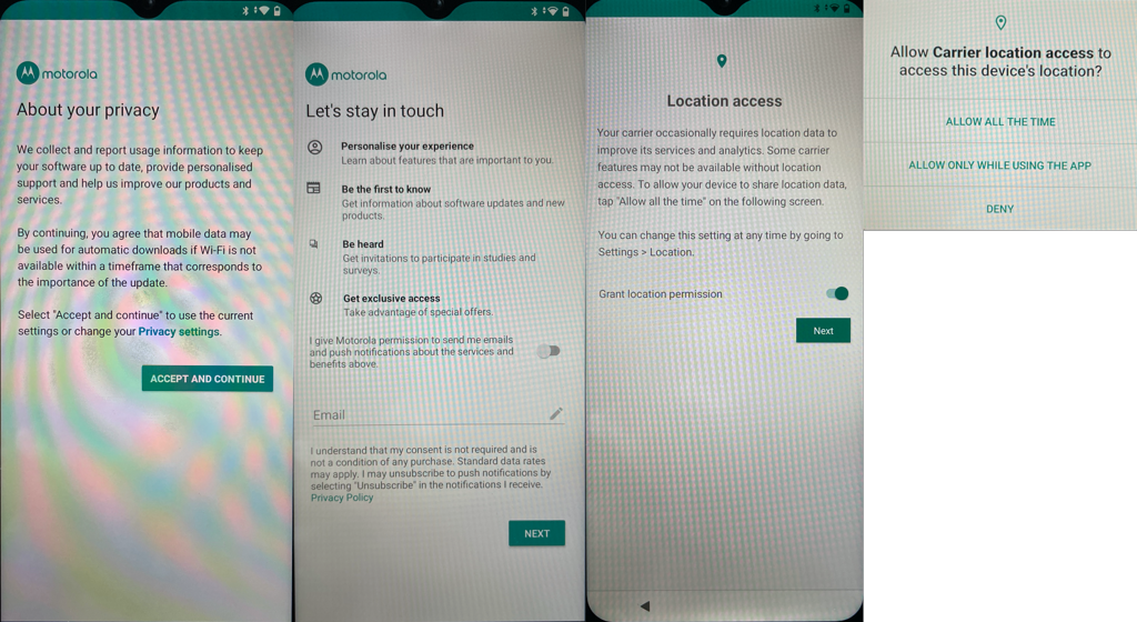 On the next 4 screens, tap ‘ACCEPT AND CONTINUE, then ‘NEXT’, then ‘NEXT’ and finally ‘ALLOW ALL THE TIME’