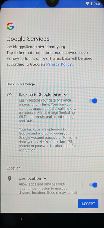 Before you turn on the phone, you need to create a Google account using your MacIntyre email address.