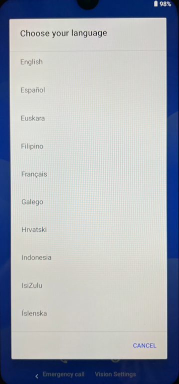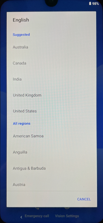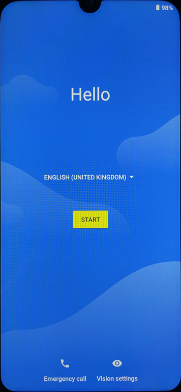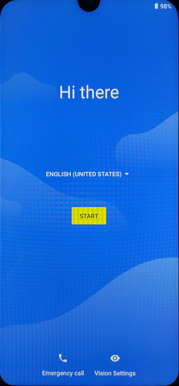 Once the phone has started up, on the 'Hi there' screen, tap 'ENGLISH (UNITED STATES)' to change the language.