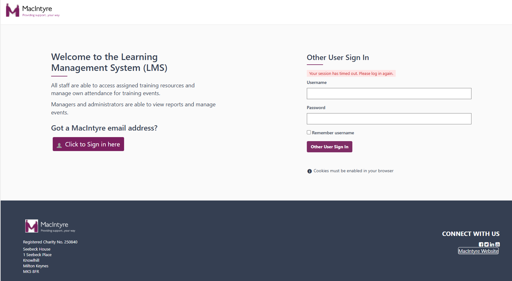 To login to the Learning Management System (LMS), if you have a MacIntyre email address you will need to click on the access link on the left hand side of the login page.