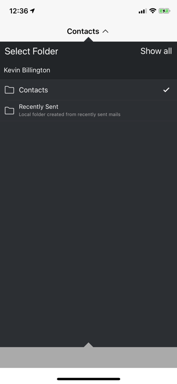 You can view any contact folders by tapping 'Contacts' at the top of the screen, then tap the folder you want
