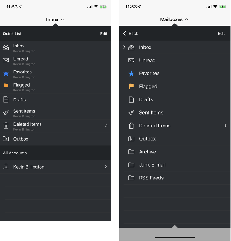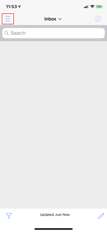 If you need to look at another email folder, tap 'Inbox' at the top of the screen, then tap the folder you want to look at. For sub folders, tap your name at the bottom of the list.