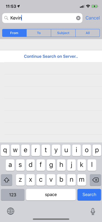 The initial search is for emails synchonised to the device, so if it doesn't show the email you're looking for, tap 'Continue Search on Server...' and it will do just that.